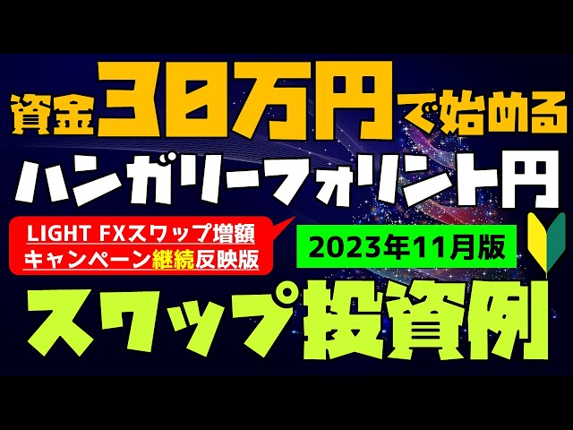 2023年11月上旬のハンガリーフォリント円の為替レートと、今月のLIGHT FXのキャンペーンスワップポイントをもとに考えた、スワップ投資の30万円の資金での設定例を計3つご覧いただきました。
