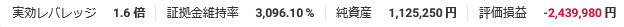 私の口座の本日記事投稿時点の実効レバレッジと口座維持率・評価損益(含み損益)は以下のようになっています。