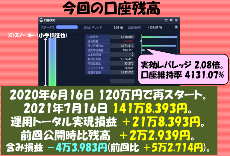 当サイト管理人のスノーキーこと小手川征也です。 FX会社比較はこちら。 人気のリピート系FX比較はこちら。 ほぼ月に一度のペースで定期的にお送りしていますアイネット証券・ループイフダンの検証記事ブログ … 続きを読む ドルカナダが活躍 4通貨ペア分散 スノーキーのループイフダン 検証 2021年7月16日